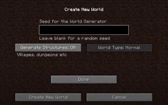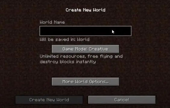 Java, PC ve Mac kullanıcıları için, Minecraft’ı başlatın ve ‘Yeni Dünya Oluştur’ düğmesini seçin. Bu, Yeni Dünya Oluştur penceresini açacaktır: