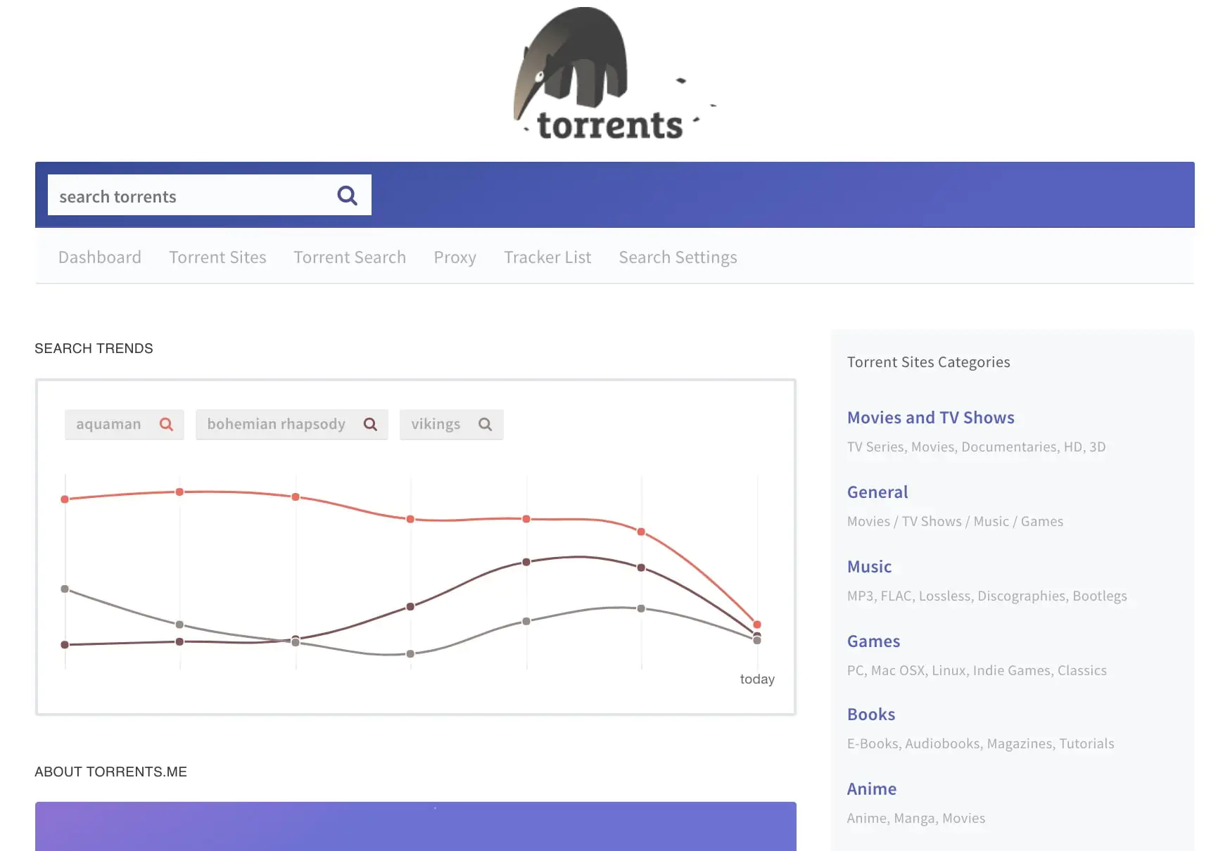 Bu popüler meta torrent arama motoru sitesi, gördüğünüz diğer BitTorrent ile ilgili siteden çok farklı. Ana sayfalarda yoğun torrent listeleri bulunurken, Torrents.me, popüler sorgular için arama eğilimlerini görüntüler. Bu trendler sıklıkla değişmeye devam ediyor ve neyin en çok arandığı ve BitTorrent kullanıcılarının aradığı şey hakkında iyi bir fikir veriyor. Kullanıcı arayüzü sade ve kullanıcı dostudur ve ortaya çıkan rahatsız edici reklamlar görmezsiniz. Sol üstteki arama düğmesini kullanarak, istediğiniz torrent’i arayabilir ve ilgili BitTorrent indirmesini alabilirsiniz.