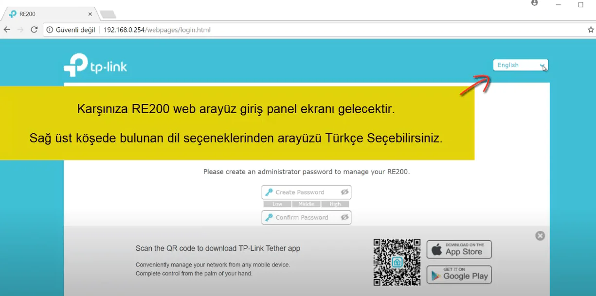 genişleticiye bağlandıktan sonra boş bir internet sayfası açarak üstteki arama yerine tarayıcı çubuguna yani 192.168.0.254 yazıp aratalım sonrasında sayfanın orta kısmındaki parola oluşturma kısmından kendimize uygun arayüz şifresi oluşturalım ve başlangıç butonuna basalım burda 2.4 ghz ağları onumuze getircek burdan kendi ağımızı bulup üstüne tıklayalım ve alt taraftan şifre kısmına ağın mevcut wifi şifresini yazalım daha sonra ileri butonuna tıklayarak bu seferde 5 ghz ağ için aynı işlemleri gerçekleştirelim eğer 5 ghz ozelliği ana modemde yok ise sağ alttan atla butonuna tıklıyoruz gelen bır sonraki sayfadan genişletici wifi adlarını değiştirebilirsiniz isterseniz değişiklik yapmadanda devam edebilirsiniz daha sonrasında ileri butonuna tıklayınız en son ise kaydete basarak ayarlarımızı kaydedip bağlantının sağlanıp sağlanmadığını kontrol edin.
