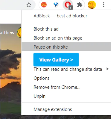 - Alternatif olarak, yalnızca tarayıcınızda açık olan web sitesi için AdBlock’u devre dışı bırakmak üzere bu sitede Duraklat seçeneğini belirleyebilirsiniz.