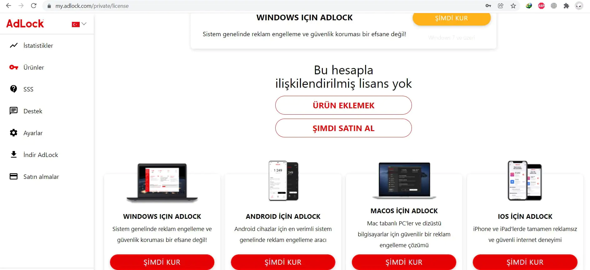 Ürünler kısmına tıkladıktan sonra karşınıza hangi işletim sistemini kullanıyorsanız işletim sisteminize uygun olan AdLock’u kurabileceğiniz sayfa açılacaktır.Burdan Windows,MacOs ,Android veya IOS için olan ŞİMDİ KUR seçeneklerinden işletim sisteminize uygun olana tıklayarak indirme işlemini başlatıp programı cihazınıza yükleyin.