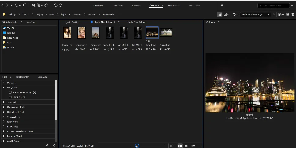 Adobe Bridge’i başlattığınızda, karşınıza temiz ve kullanıcı dostu bir arayüz gelir. Sol tarafta dosya gezgini gibi kullanabileceğiniz bir panel, sağ tarafta ise seçili dosyalarınızın önizlemelerini görebileceğiniz bir panel bulunur. Bu arayüz, medya dosyalarınızı kolayca organize etmenize olanak tanır.