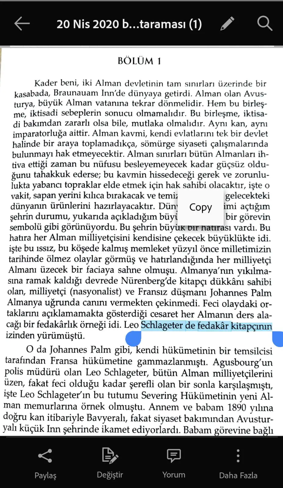 Devam et dedikten sonra PDF dosyamız tamamen hazır oluyor. Artık metnin tamamını birine gönderebilir yada belirli kısımları kopyala yapıştır yaparak alıntılayabiliriz.