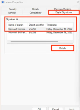 İmzasını doğrulamak için, Dosya Gezgini’nde dosyaya göz atın, dosyaya sağ tıklayın ve Dijital İmzalar sekmesinde doğru imzayı doğrulayın.