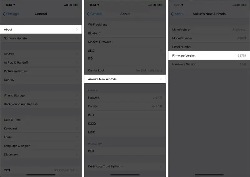 - Firmware Sürümü (Firmware Version) bölümüne gelmek için ekranı aşağı kaydırın ve AirPods cihazınızın ismine dokunun.
