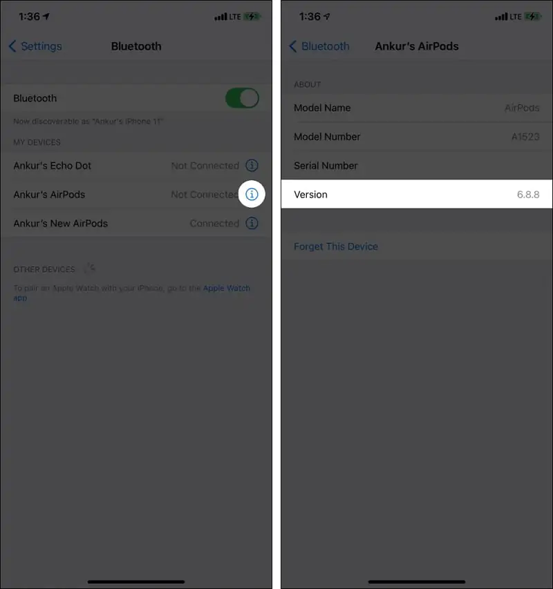 - Yazılımı sürümünü görmek için, AirPods isminin yanındaki (i) öğesine dokunun.