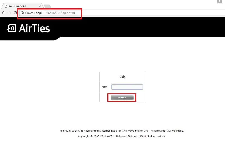 • Arayüze girmek için bir tarayıcı açıp, adres satırına 168.2.1 yazdıktan sonra Enter’a basalım.