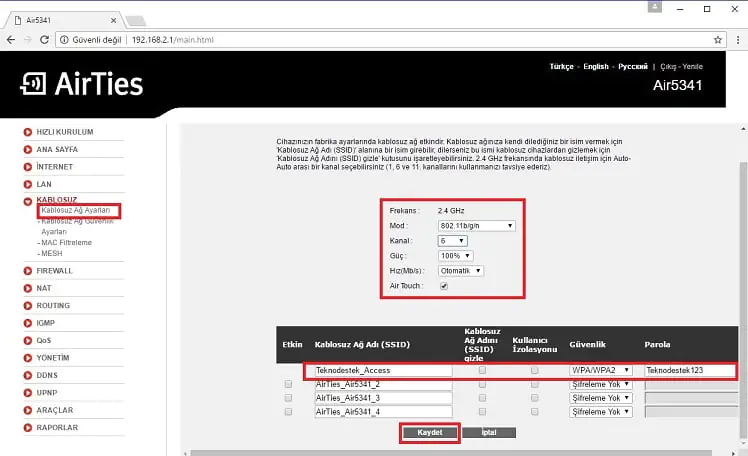 • Kablosuz Ağ Adı‘mızı ve Parola‘mızı aşağıdaki örneğe uygun şekilde belirledikten sonra Kaydet’e tıklayalım.