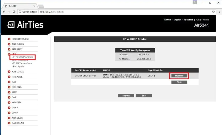 Daha sonra LAN menüsü altında “IP ve DHCP Ayarları” kısmına tıkayalım.