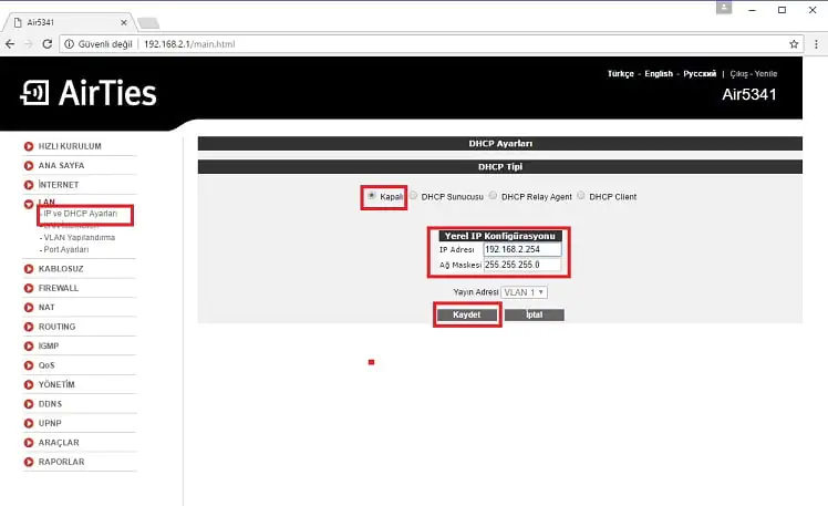 Daha sonra aşağıda görüldüğü gibi “DHCP Tipi” başlığı altındaki seçeneklerden “Kapalı” seçeneğini seçelim ve “Yerel IP Konfigürasyonu” bölümünde ise “IP Adresi” kısmını 168.2.254 olarak değiştirelim ve Kaydet’e tıklayalım.