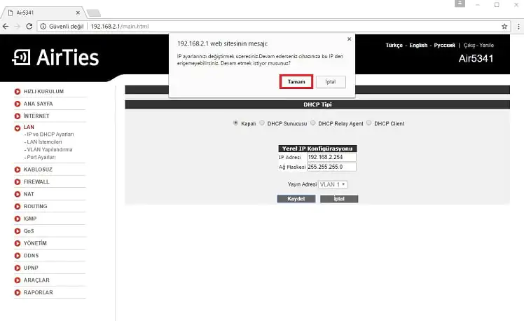 Son adımda ise cihazımız bizi uyarıyor; “IP Adresi” kısmını 168.2.254 olarak değiştirdiğimiz için, 192.168.2.1 üzerinden modemin arayüz ekranına ulaşamayacağız; Tamam’a tıklayalım.