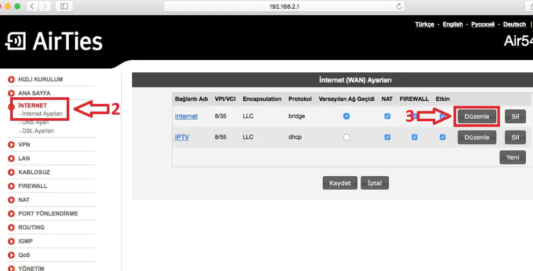 - Daha sonra, açılan arayüz sayfasında sol tarafta bulunan menü listesinde sırasıyla ‘İnternet’ ⟶ ‘İnternet Ayarları’ menülerine tıklıyoruz ve açılan sayfada ‘İnternet’ satırının sonundaki ‘Düzenle’ butonuna tıklıyoruz.