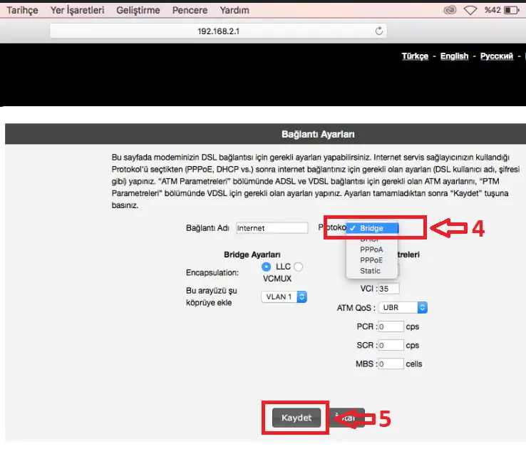 - Son adımda ise, ‘Protokol’ ayarını ‘Bridge’e çekiyoruz ve ‘Kaydet’ diyerek işlemleri noktalıyoruz.