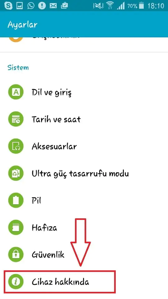 Gelecek olan ekranda sayfayı aşağıya doğru çektiğimizde, en alt kısımda “Cihaz Hakkında” diye bir yazı göreceksiniz; bu menüye tıklayıp işlemlerimize devam ediyoruz.