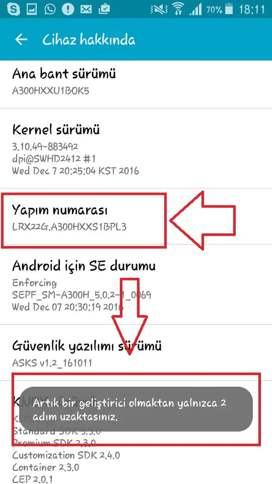 İşlemlerimizin devamında, gelecek olan sayfayı yine aşağıya doğru çektiğimizde, “Yapım Numarası” ya da bazı cihazlarda “Derleme Numarası” olarak görünen menüye peş peşe 7 kez dokunmanız durumunda ekranda, “Artık bir geliştirici olmaktan yalnızca 2 adım uzaktasınız” diye bir uyarı alacaksınız. Bu uyarıyı üzerine, o alana tıklamaya devam etmemiz halinde geliştirici ayarları açılacaktır.