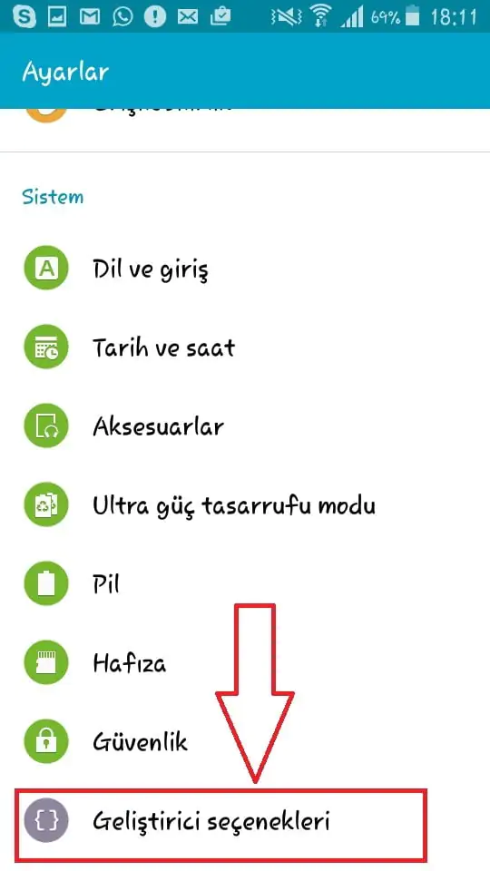 Yaptığımız işlemler sonrasında yine “Ayarlar” bölümüne giriş sağlıyoruz. Gelen ekranı aşağıya doğru çektiğimizde, artık karşımıza “Cihaz Hakkında” yazısı yerine “Geliştirici Seçenekleri” diye bir menü çıkacaktır. Bu menüye giriş yapıyoruz.
