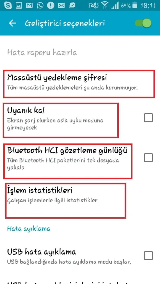 Android Geliştirici Ayarlarını Açma işlemlerini tamamlamış bulunmaktayız. Buradaki mod ayarlarınızı kendinize uygun şekilde ayarlayabilir; buna yönelik işlem gerçekleştirebilirsiniz.