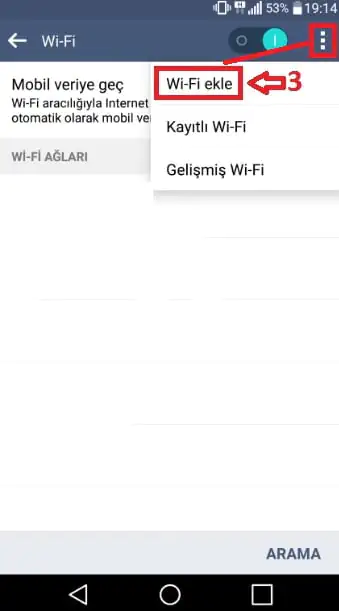 Daha sonraki ekranda ise sağ üstte bulunan menü tuşuna basıyoruz ve açılan seçeneklerden Wi-Fi ekle butonuna basıyoruz.