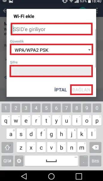 “Wi-Fi ekle” ekranında ise sırasıyla ekleyeceğimiz gizli ağın SSID adını, GÜVENLİK türünü ve şifresini yazmamızın ardından sağ altta bulunan BAĞLAN tuşuna basıyoruz.