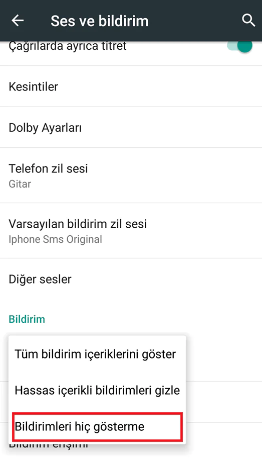 - Açılan sayfada “Bildirimleri hiç gösterme” bölümünü seçmeniz yeterli olacaktır.