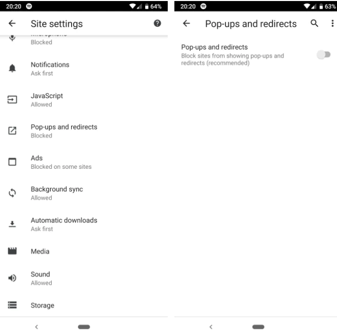 Bu menüde, web sitelerinin cihazınızla nasıl etkileşimde bulunabileceğini etkileyen özelliklerin bir listesini görürsünüz. Açılır pencerelere dokunun ve kaydırıcının kapalı (gri) konumuna ayarlandığından emin olun. Chrome, pop-up’ları ve sizi gitmek istemediğiniz yerlere yönlendiren siteleri engeller.