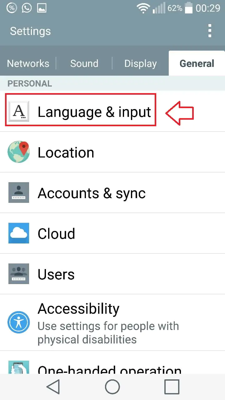 “General” sekmesine tıkladıktan sonra açılan sayfada “Language & input” menünüsüne dokunalım; aşağıdaki resimde görüldü gibi.