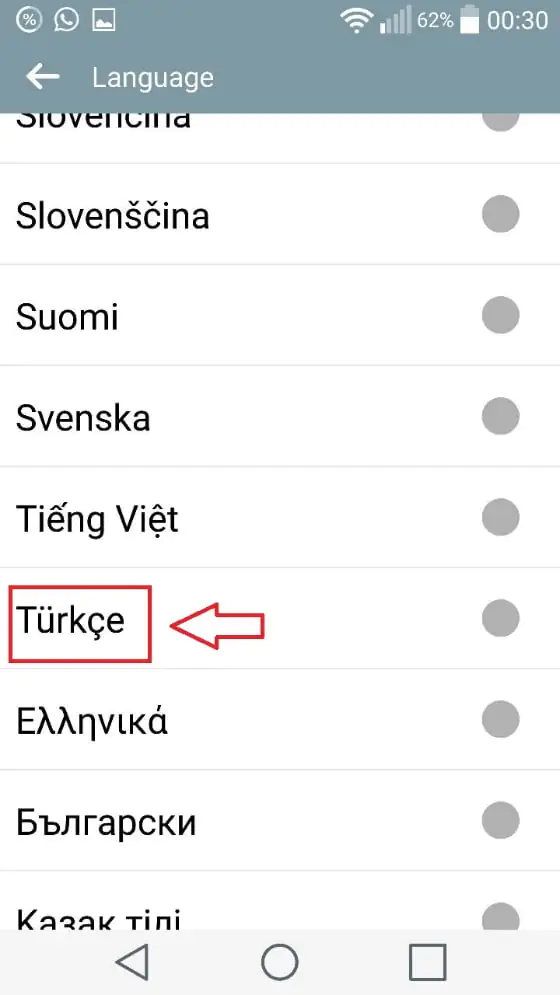 Yukarıdaki resimdeki gibi “Türkçe” dil seçeneğini seçtikten sonra telefonunuzun dili “Türkçe” olacaktır.