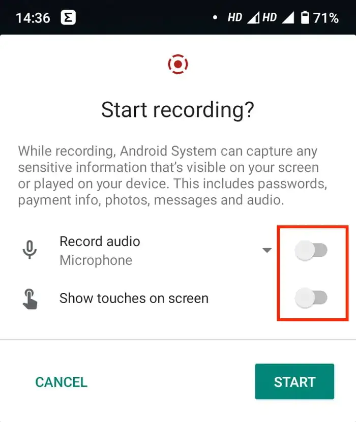 - Ekran kaydınızla ses kaydetmek isteyip istemediğinizi ve ekrana dokunduğunuz yeri göstermek isteyip istemediğinizi seçin. Bu ayarlardan herhangi birini açmak için, butonları (tuşları) sağa kaydırın.