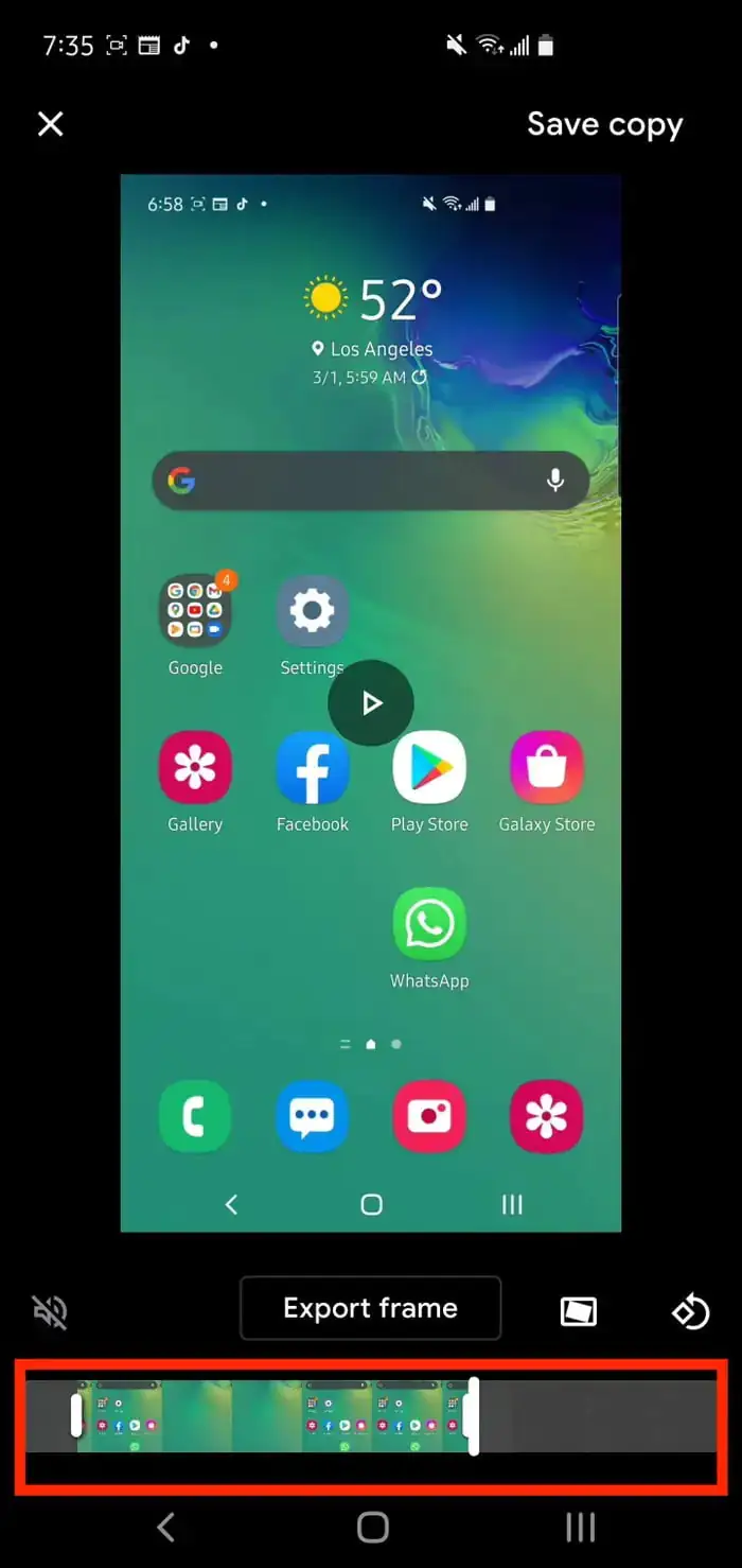 - Kırpma (kesme) işlemi tam istediğiniz gibi olduğundan, ekranın üst kısmındaki Bir kopyasını kaydet (Save a copy) seçeneğine dokunun. Artık, orijinal ekran kaydının düzenlenmiş bir versiyonuna sahipsiniz.