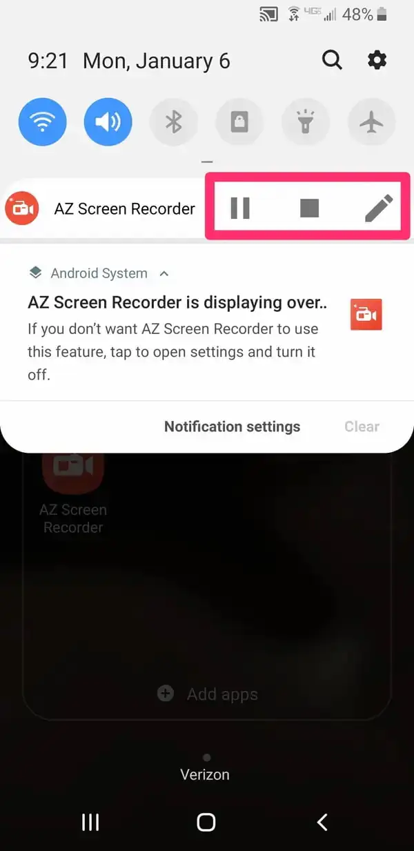 - Kaydı durdurmak istediğinizde, bildirimler menüsünü açmak için, parmağınızı ekranın üst kenarından aşağı doğru kaydırın. Bu panelden kaydı duraklatabilir veya durdurabilir veya videonun üzerine çizim yapmak için kurşun kalem simgesine dokunabilirsiniz.