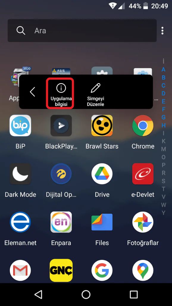 - Açılan bağlam menüsünde “Uygulama bilgisi” seçeneğine dokunun.