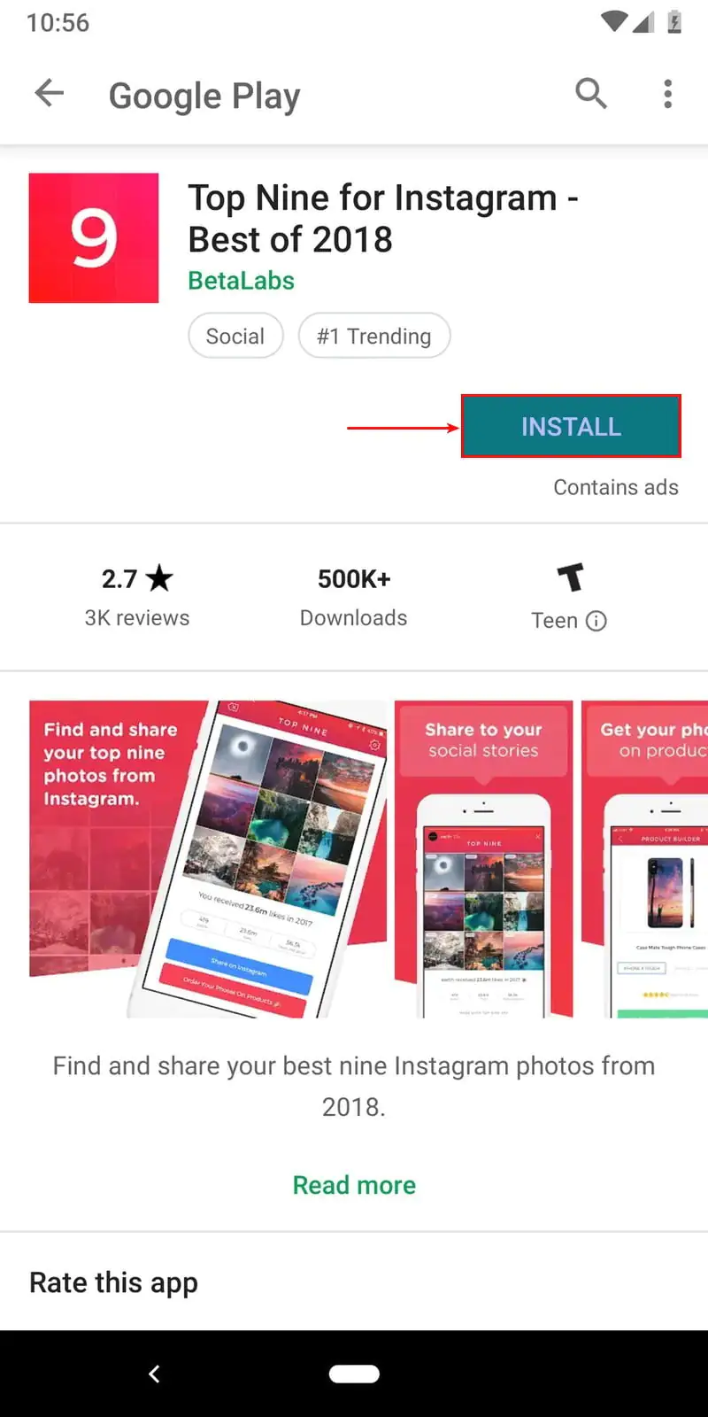 • Top Nine for Instagram isimli uygulamaya dokunun ve açılan uygulama sayfasında ‘YÜKLE (INSTALL)’ butonuna dokunun.