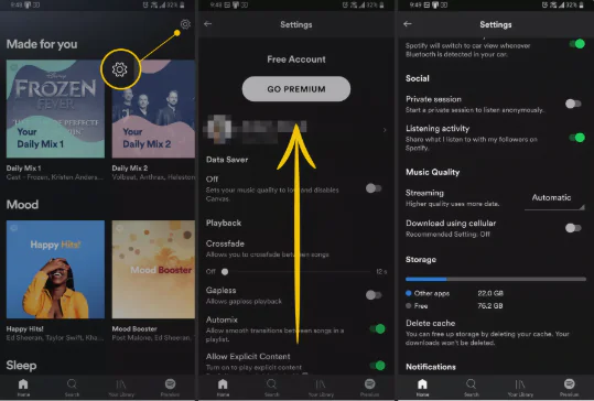 Spotify açıkken, sağ üst köşedeki Ayarlar dişli çarkına dokunun.