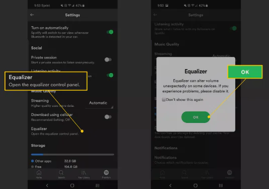 Android için Spotify, yerleşik bir Ekolayzer ile birlikte gelmez. Bunun yerine, doğrudan telefonunuzun işletim sisteminde bulunan ekolayzere bir kısayol sunar.