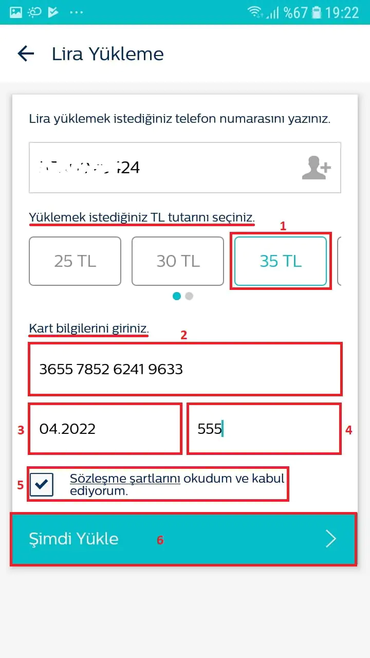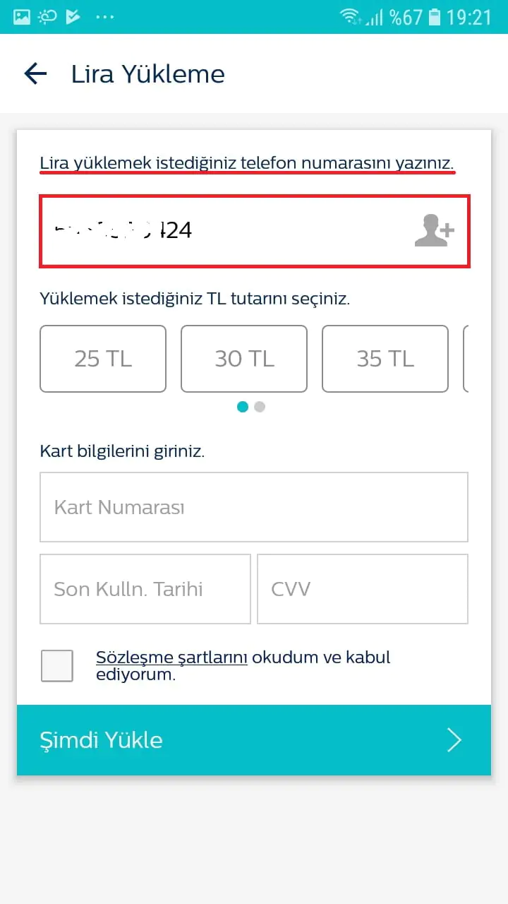 • Kart bilgilerimizi giriyoruz. Sözleşme şartlarını kabul ettiğimize dair ilgili kutucuğu işaretledikten sonra ‘Şimdi Yükle’ butonuna dokunuyoruz.