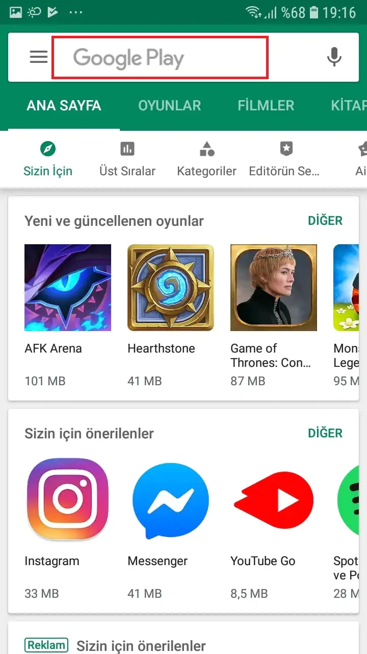 • Arama kutucuğuna dokunuyoruz.