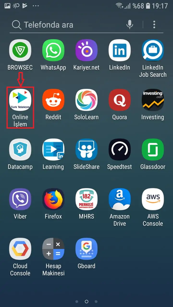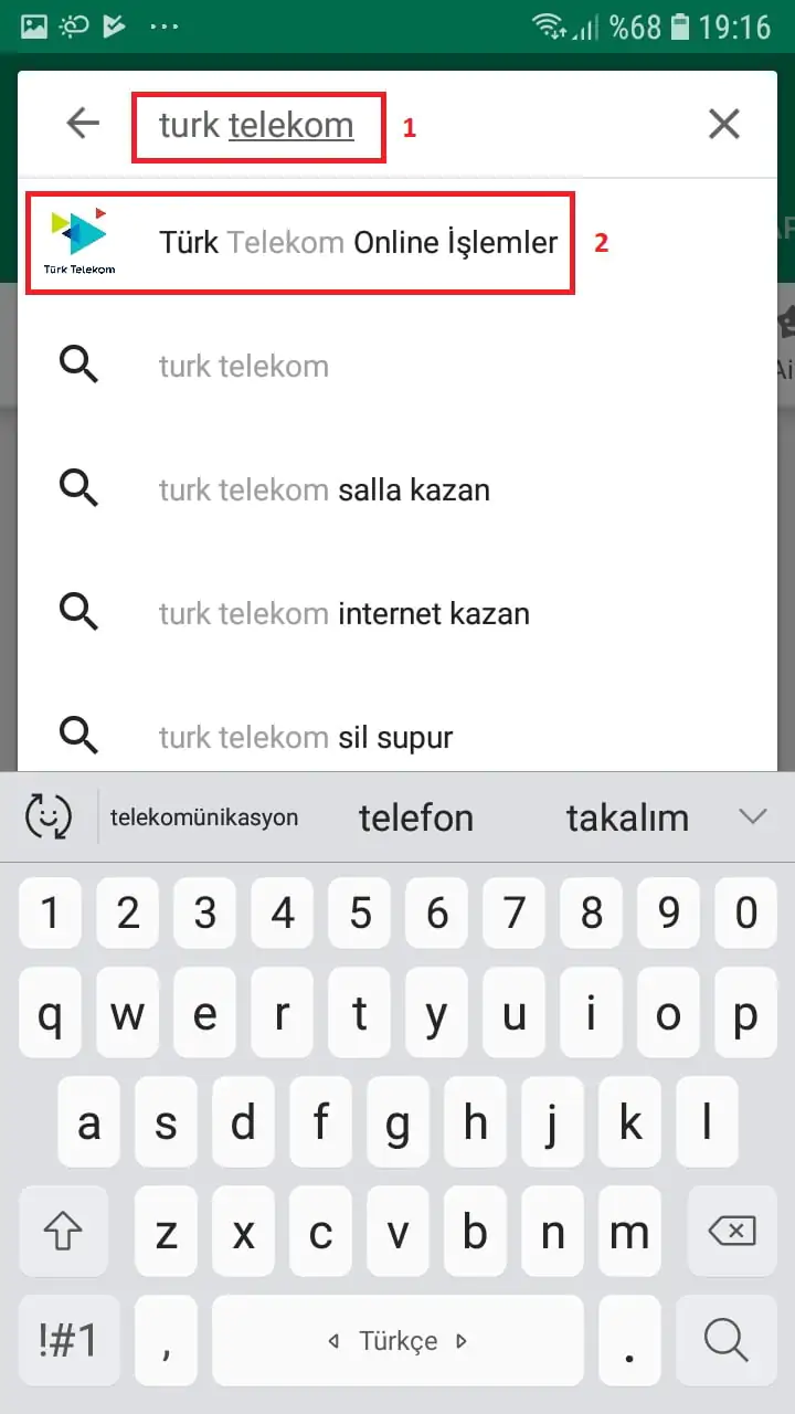 • Arama kutucuğuna ‘turk telekom’ yazıyoruz ve arama seçeneklerinden ‘Türk Telekom Online İşlemler’ seçeneğine dokunuyoruz.