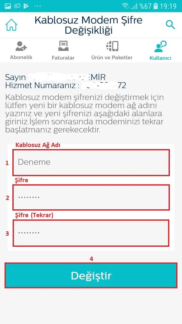 • Gelen ekranda değiştirmek istediğimiz yeni kablosuz ağ adımızı ve şifremizi ilgili kutucuklara yazdıktan sonra ‘Değiştir’ butonuna dokunuyoruz.