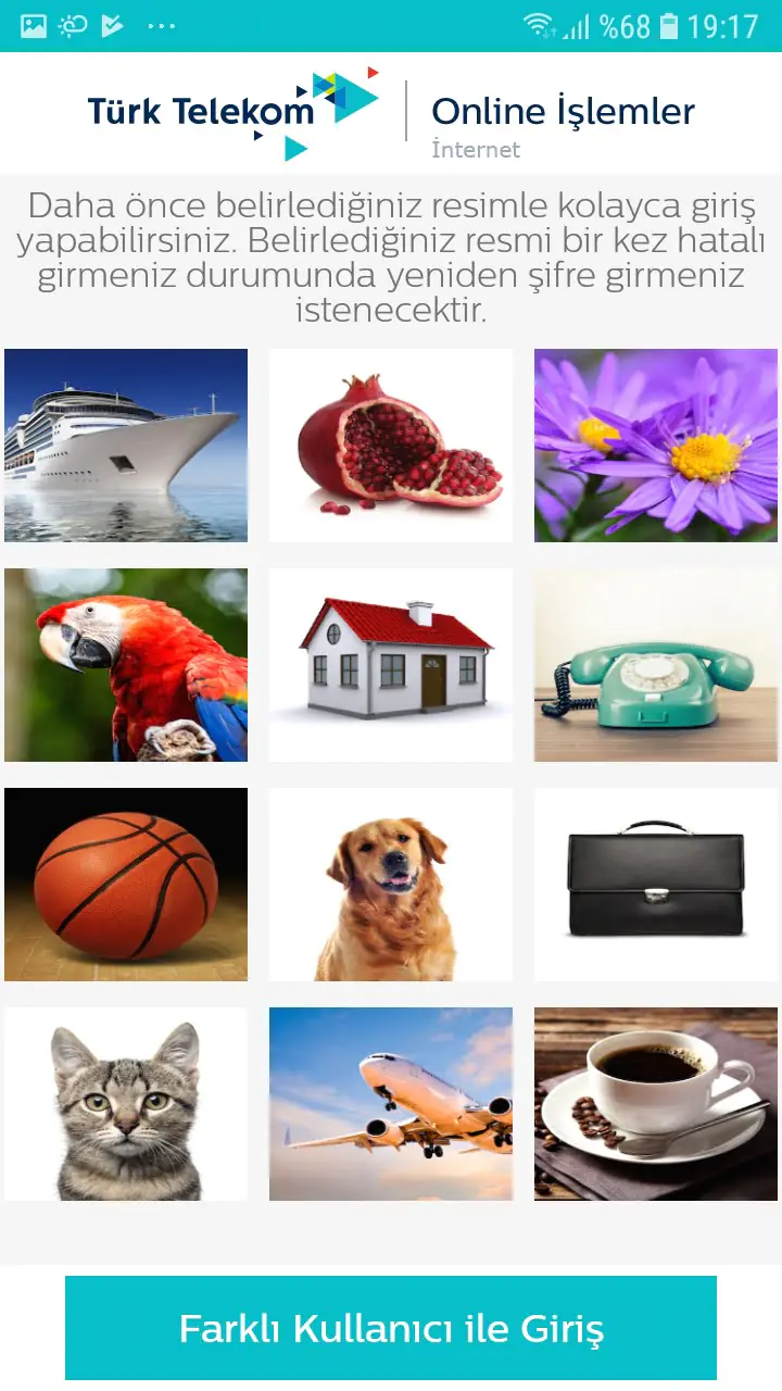 İlk ekranda, bu bilgilerden birini girip ilerledikten sonra, SMS ile size tek kullanımlık bir şifre gönderilecek. Bu şifre ile oturum açtıktan sonra, bundan sonraki oturumları güvenlik resmi seçerek açmanız önerilecek (kolaylık açısından). Bu seçeneği kullanmanızı öneririm. Bir güvenlik resmi seçiyoruz ve daha sonra bu güvenlik resmi ile tekrar oturum açıyoruz.