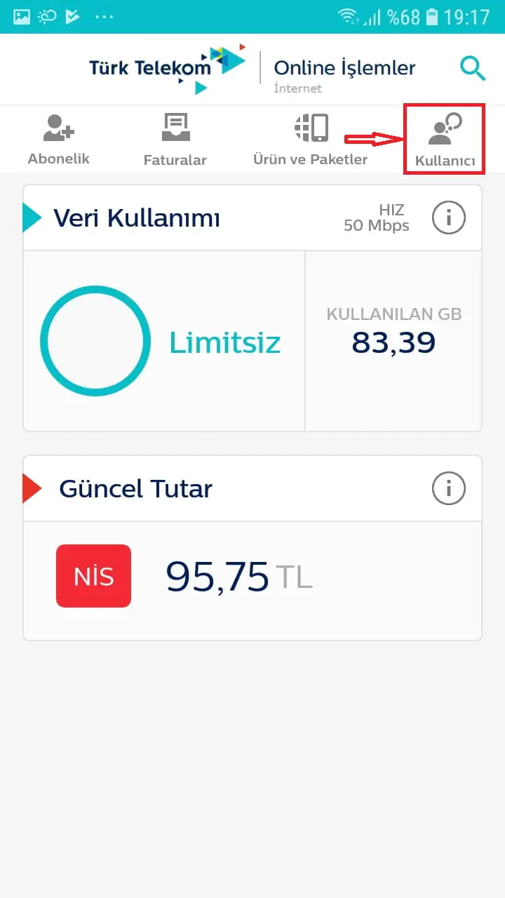 • Hesaba giriş yaptıktan sonra gelen ekranda üst kısımda bulunan menülerden ‘Kullanıcı’ seçeneğine dokunuyoruz.