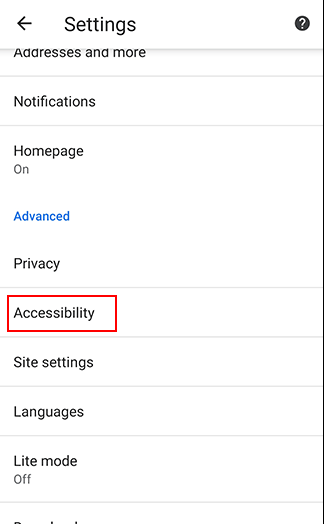 “Ayarlar” menüsünde aşağı kaydırın ve Chrome’un erişilebilirlik menüsüne girmek için “Erişilebilirlik” e hafifçe vurun.
