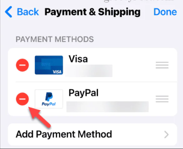 Artık ödeme yöntemlerinizin bir parçası olmak istemediğiniz eski ödemenin yanındaki kırmızı düğmeye dokunun; örneğimizde PayPal’dan kurtuluyoruz.