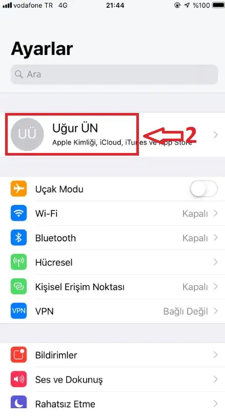 • Sonrasında ise açılan Ayarlar menüsü üzerinde bulunan Apple kimliğimizi seçiyoruz.