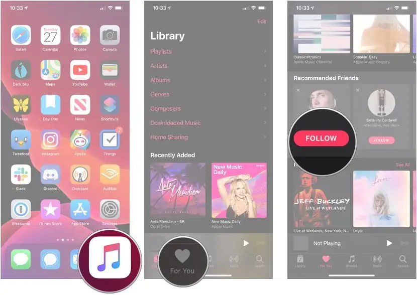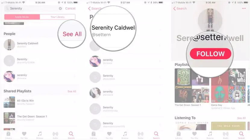 - Apple Müzik (Apple Music)’i paylaşan herkesin yanındaki Takip et (Follow) butonuna dokunun.