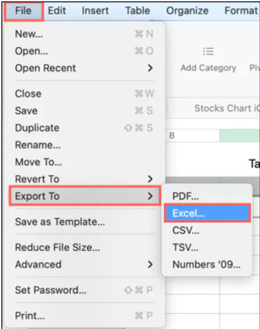 Dosyanız Numbers’da açıkken, menü çubuğundan Dosya > Şuraya Aktar > Excel’e gidin.