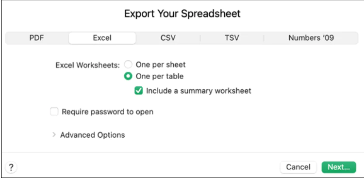 Excel Çalışma Sayfaları : Her tablo için mi yoksa her sayfa için bir çalışma sayfası mı istediğinizi seçin. Her tablo için bir sayfa seçerseniz, isteğe bağlı olarak kitaba bir özet çalışma sayfası ekleyebilirsiniz. Bu, çalışma kitabındaki her tabloya bir bağlantı sağlar.