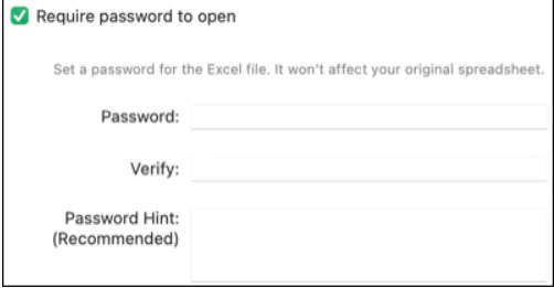Açmak için Parola Gerektir : Çalışma kitabı hassas veriler içeriyorsa, onu parolayla koruyabilir ve alıcınıza bu parolayı sağlayabilirsiniz. Parolayı ayarlayın, doğrulayın ve isteğe bağlı olarak bir ipucu ekleyin.