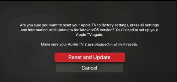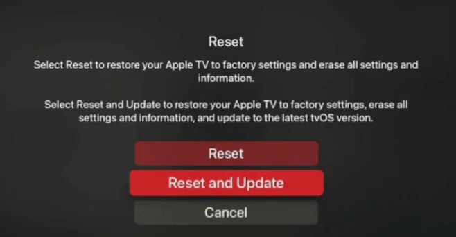 • Şimdi, sıfırlama seçeneğinizi seçin. Apple TV’yi fabrika ayarlarına geri yüklemek ve tüm ayarları ve bilgileri silmek için Sıfırla seçeneğini kullanabilir veya her şeyi silmek ve aynı zamanda tvOS’un en son sürümüne güncellemek için Sıfırla ve Güncelle’yi seçebilirsiniz.