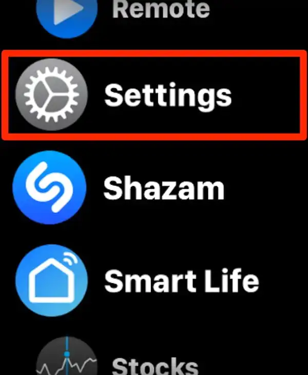 - Apple Watch‘ta uygulama listesini görüntülemek için dijital ayar butonuna (tuşuna) (Digital Crown) basın ve gelen listede Ayarlar (Settings) seçeneğine dokunun (Uygulamaları, menü ekranı görünümünde bir dizi simge olarak görüyorsanız, dişli çark şeklindeki simgeye dokunun).