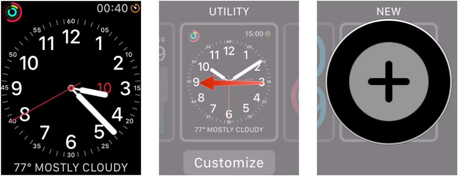 - Apple Watch cihazınızın ekranına sıkıca bastırın. Ekranda saat arayüzlerini teker teker son arayüze kadar kaydırmak için Dijital Taç düğmesini sağa-sola döndürün.